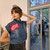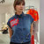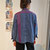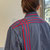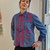 mit einem Muster aus aufgenähten Gurtbändern in rot und blau.